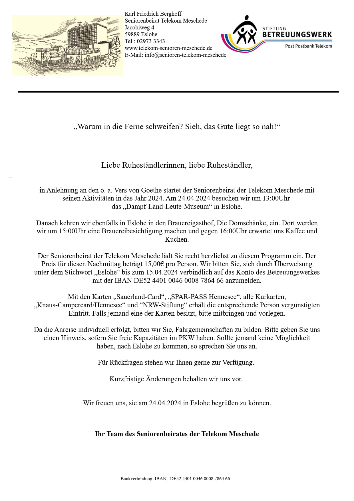 Im Newsletter des letzten Monats haben wir bereits auf unsere erste Veranstaltung in diesem Jahr hingewiesen, dem Besuch des Museums " Dampf Land Leute Museum Eslohe " sowie der anschließenden Brauerei Besichtigung. Heute liegt dem Newsletter die Einladung hierzu bei mit den entsprechenden näheren Informationen.